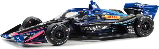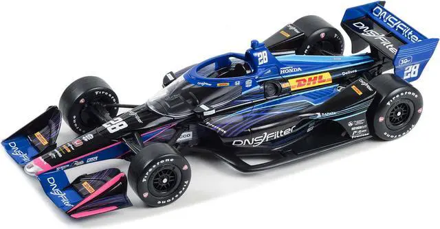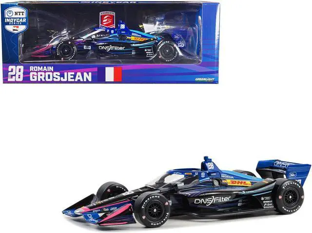 Brand new 1/18 scale diecast car model of Dallara IndyCar #28 Romain Grosjean "DNSFilter" Andretti Autosport (Road Course Configuration) "NTT IndyCar Series" (2023) die cast model car by Greenlight.