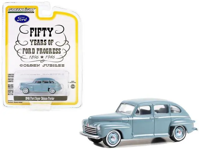 Brand new 1/64 scale diecast car model of 1946 Ford Super Deluxe Fordor Light Blue "Fifty Years of Ford Progress - Golden Jubilee" "Anniversary Collection" Series 16 die cast model car by Greenlight.