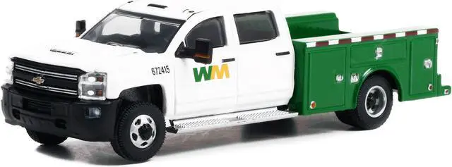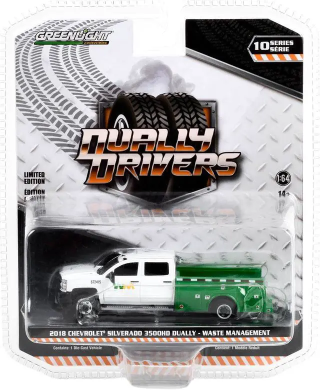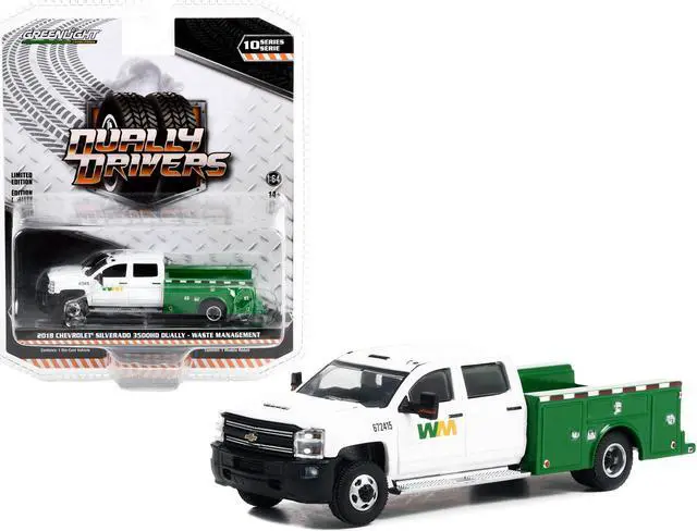 Brand new 1/64 scale diecast car model of 2018 Chevrolet Silverado 3500HD Dually Service Truck White and Green "Waste Management" "Dually Drivers" Series 10 die cast model car by Greenlight.