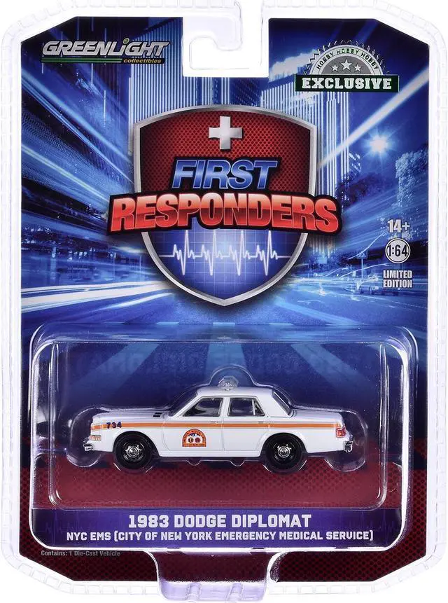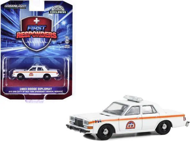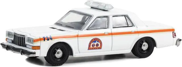 Brand new 1/64 scale diecast car model of 1983 Dodge Diplomat "NYC EMS (City of New York Emergency Medical Service) " White with Orange Stripes "First Responders - Hobby Exclusive" Series die cast model car by Greenlight.