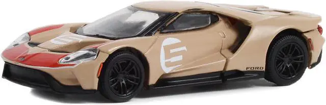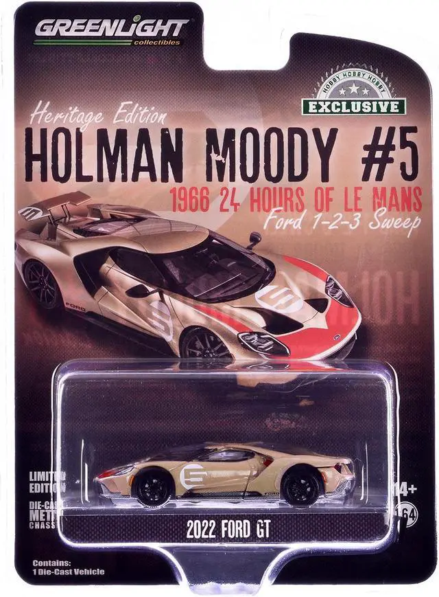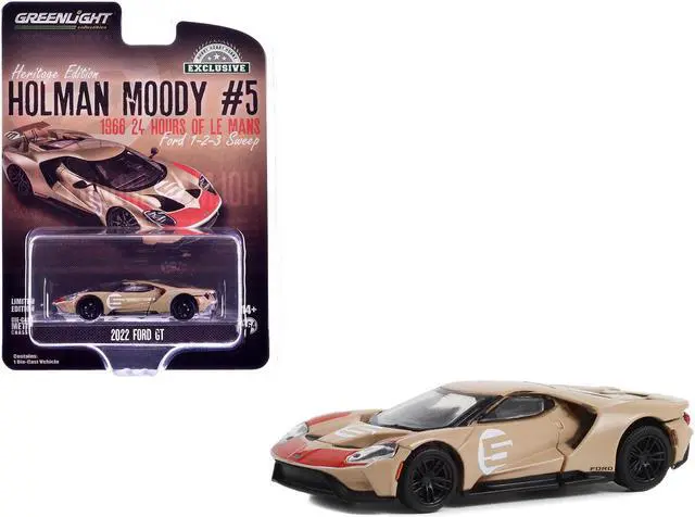 Brand new 1/64 scale diecast car model of 2022 Ford GT Heritage Edition #5 Holman-Moody "1966 24 Hours of Le Mans Ford 1-2-3 Sweep Tribute" Gold Metallic with Red Accents "Hobby Exclusive" Series die cast model car by Greenlight.