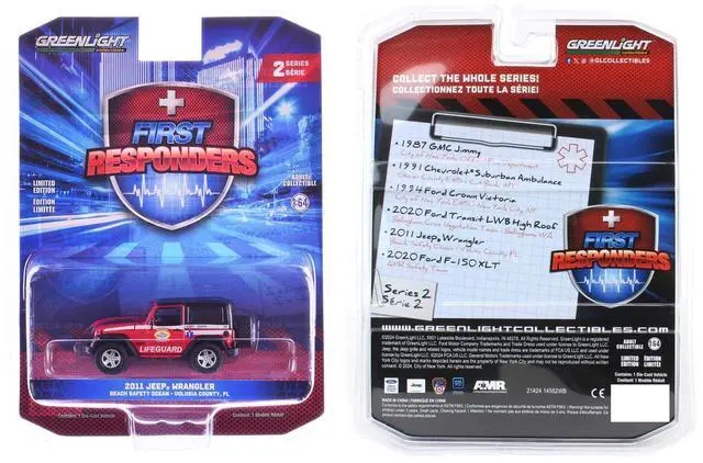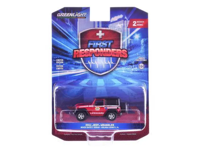 Brand new 1/64 scale diecast car model of 2011 Jeep Wrangler "Volusia County Florida Beach Safety Ocean Rescue Lifeguard/EMT" Red with White Stripes "First Responders" Series 2 die cast model car by Greenlight.