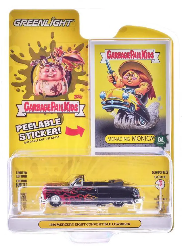 Brand new 1/64 scale diecast car model of 1950 Mercury Eight Convertible Lowrider Black with Flames "Menacing Monica" "Garbage Pail Kids" Series 7 die cast model car by Greenlight.