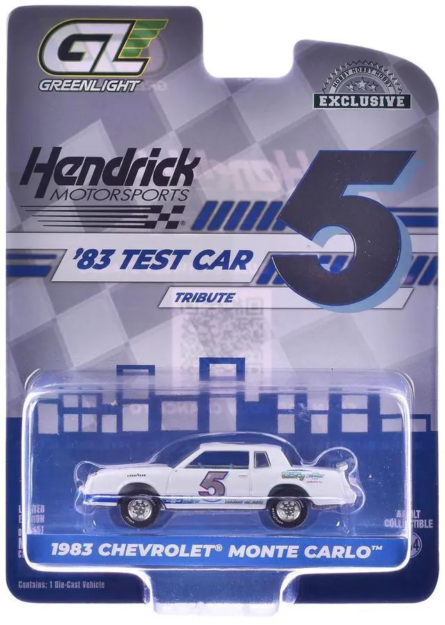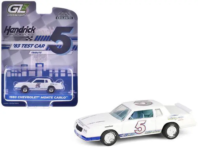 Brand new 1/64 scale diecast car model of 1983 Chevrolet Monte Carlo #5 "Hendrick Motorsports First Test Car Tribute" White with Blue Stripes and Interior "Hobby Exclusive" Series die cast model car by Greenlight.