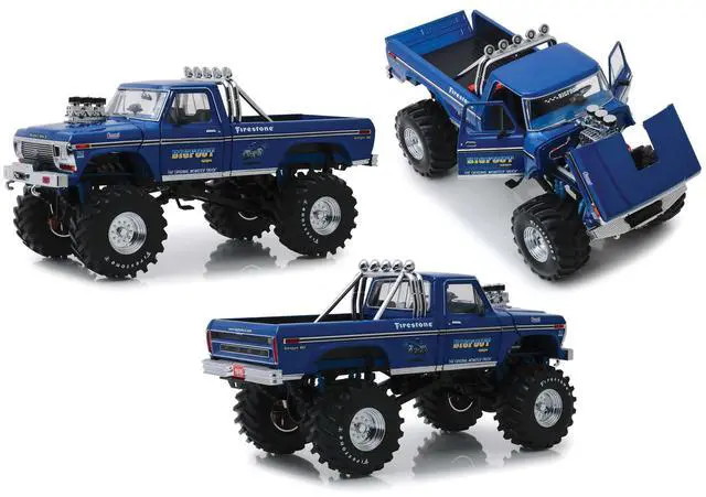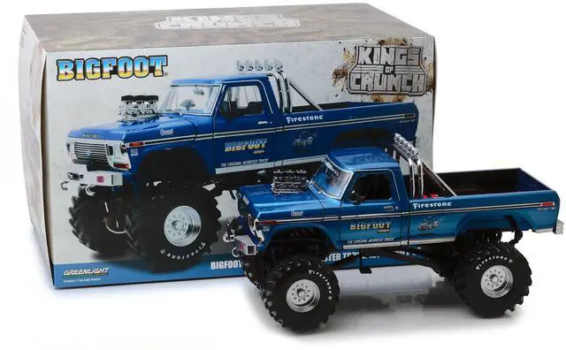 Brand new 1/18 scale diecast car model of 1974 Ford F-250 Bigfoot #1 The Original Monster Truck Blue with 48-Inch Tires "Kings of Crunch" die cast model car by Greenlight.
