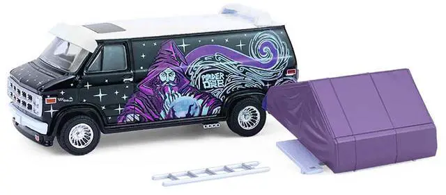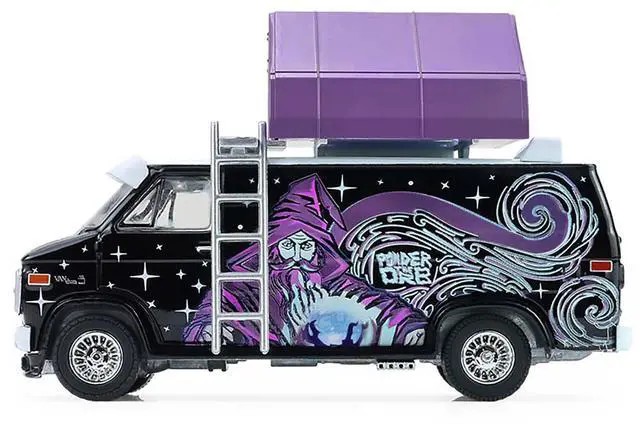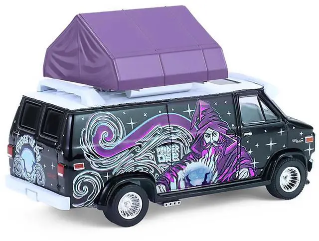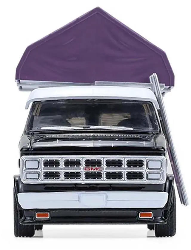 Brand new 1/64 scale diecast model of 1978 GMC Vandura Custom Van Black with Wizard Graphics and White Top with Camp'otel Cartop Sleeper Tent "The Great Outdoors" Series 4 die cast model car by Greenlight.