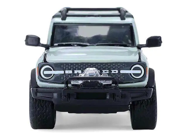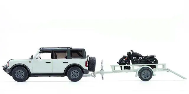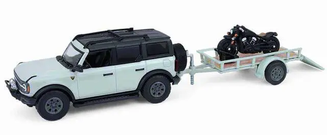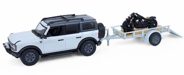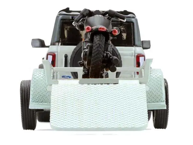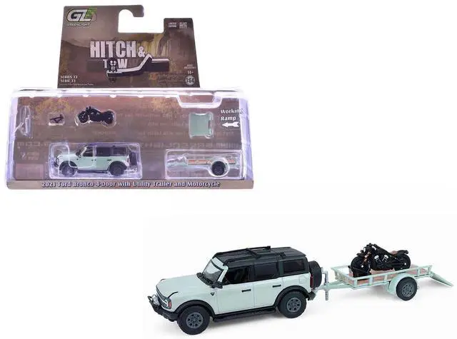 Brand new 1/64 scale diecast car models of 2021 Ford Bronco 4-Door Badlands Cactus Gray with Black Top and Motorcycle with Utility Trailer "Hitch & Tow" Series 33 die cast model cars by Greenlight.
