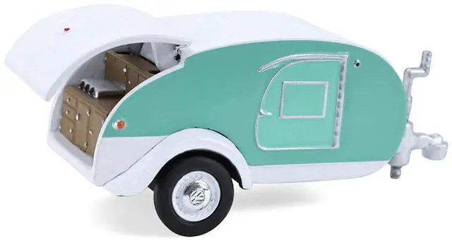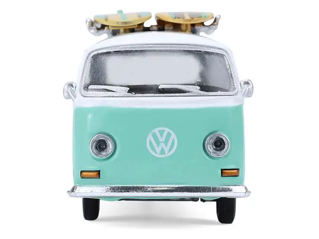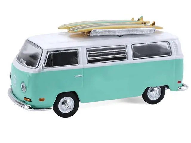 Brand new 1/64 scale diecast car models of 1971 Volkswagen Type 2 Van Seafoam Green and White with Surfboards and Teardrop Trailer "Hitch & Tow" Series 33 die cast model cars by Greenlight.