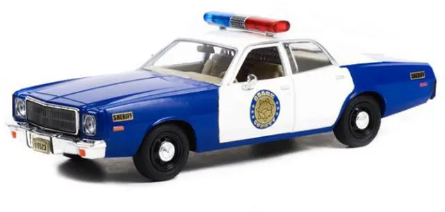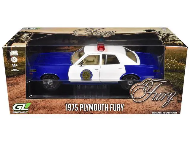 Brand new 1/24 scale diecast car model of 1975 Plymouth Fury "Osage County Sheriff" Blue and White die cast model car by Greenlight.