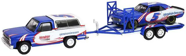 3) 1986 Chevrolet K5 Blazer Blue and White and 1969 Chevrolet Camaro #5 Blue and White "Kyle Larson - Hendrick Motorsports" with Tandem Car Trailer.