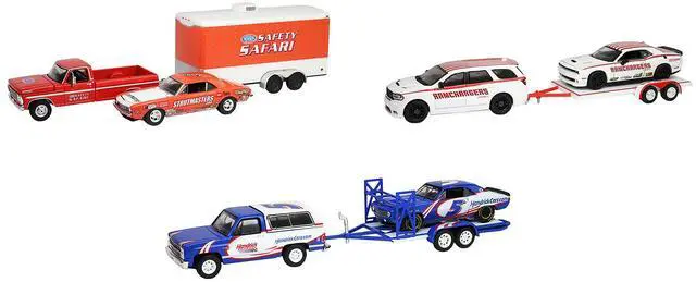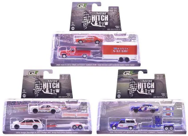 Brand new 1/64 scale diecast car models of "Racing Hitch & Tow" Series #6 Set of 3 pieces die cast car models by Greenlight.