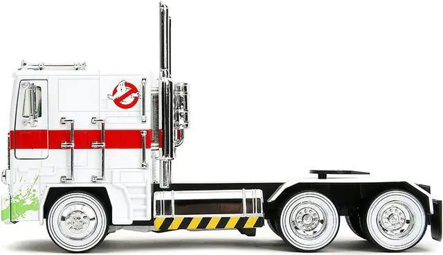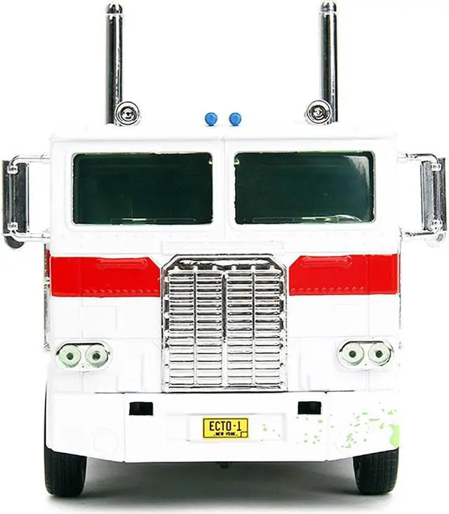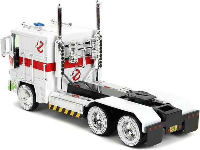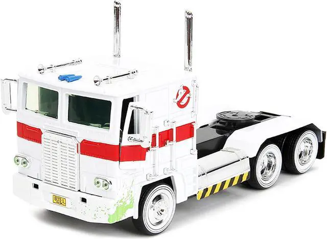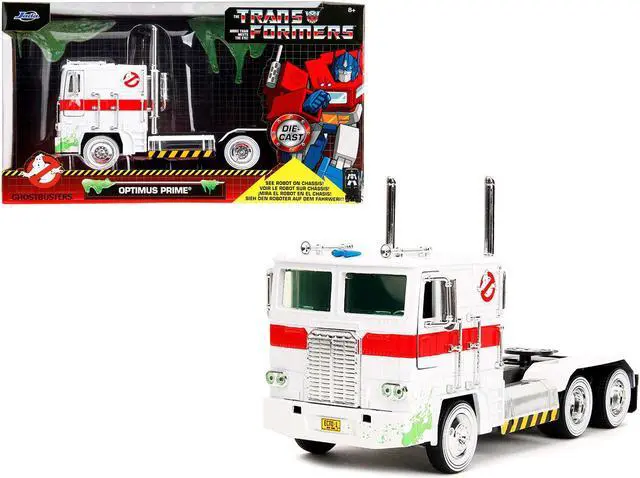 Brand new 1/24 scale diecast model of G1 Autobot Optimus Prime Truck White with Robot on Chassis from "Transformers" TV Series - "Ghostbusters" (1984) Movie Crossover "Hollywood Rides" Series die cast model by Jada.