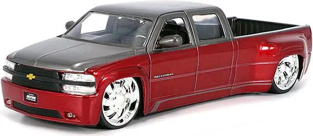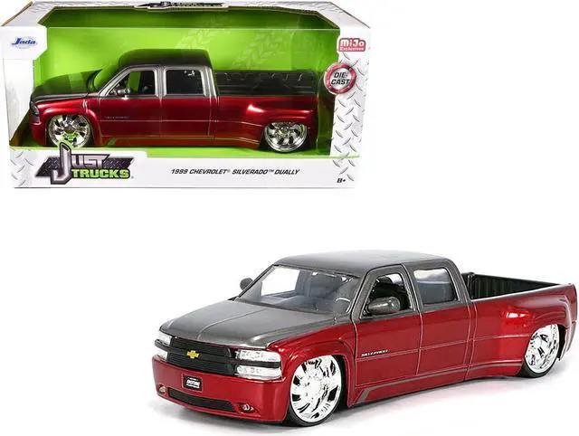 Brand new 1/24 scale diecast car model of 1999 Chevrolet Silverado Dually Pickup Truck Red Metallic and Gray with Custom KMC Wheels "Just Trucks" Series die cast model car by Jada.