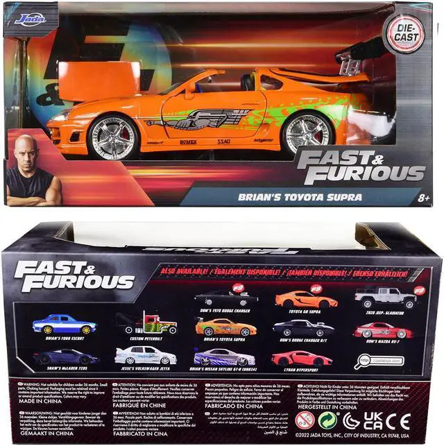 Brand new 1/24 scale diecast car model of Brian's Toyota Supra Orange with Graphics "Fast & Furious" Movie die cast model car by Jada.
