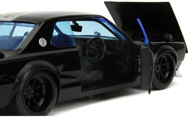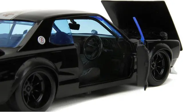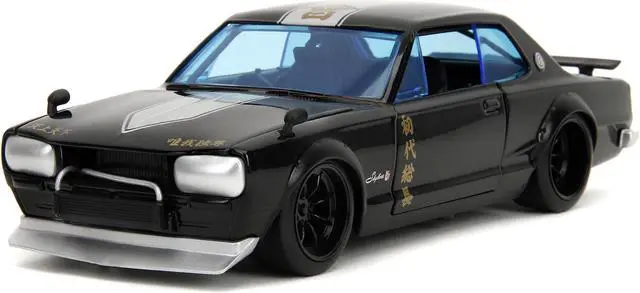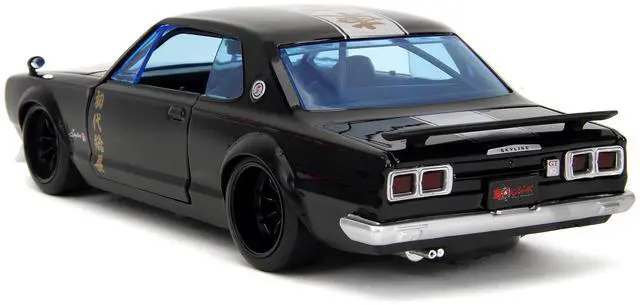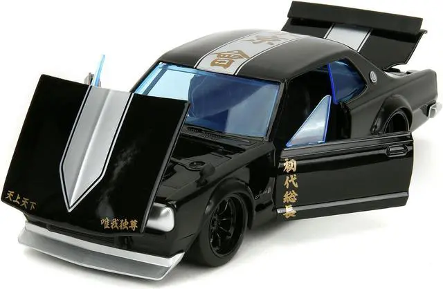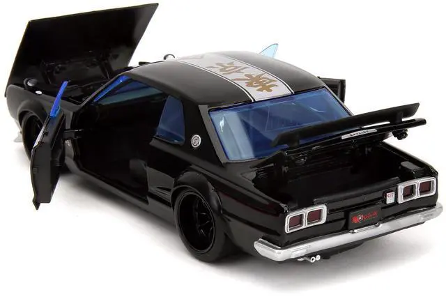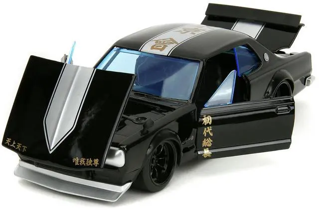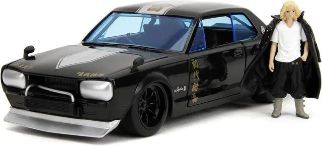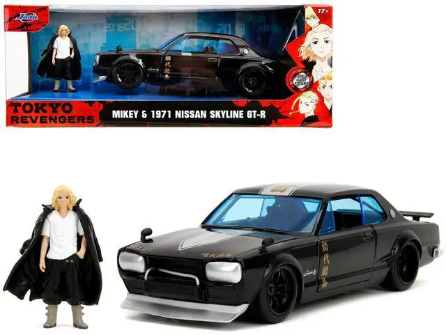 Brand new 1/24 scale diecast car model of 1971 Nissan Skyline GT-R RHD (Right Hand Drive) Black with Silver Stripe and Mikey Diecast Figure "Tokyo Revengers" (2021) TV Series "Anime Hollywood Rides" Series die cast model car by Jada.