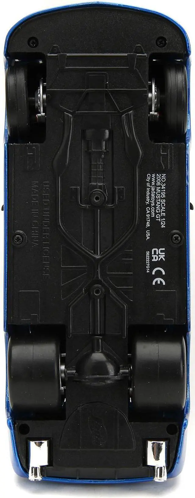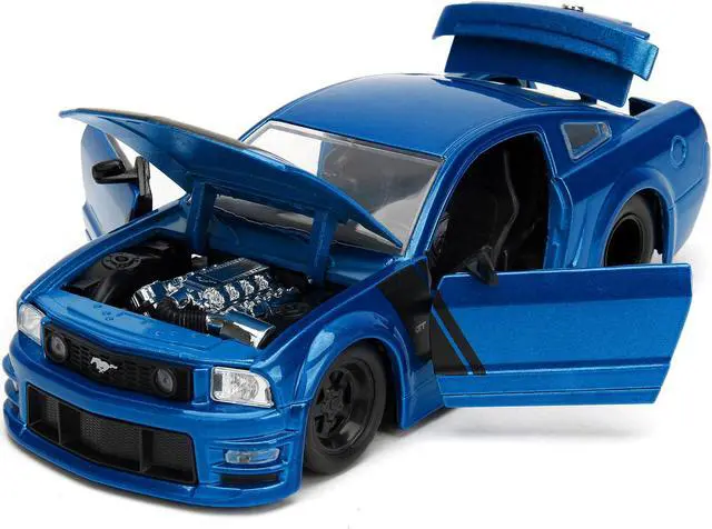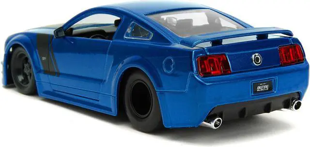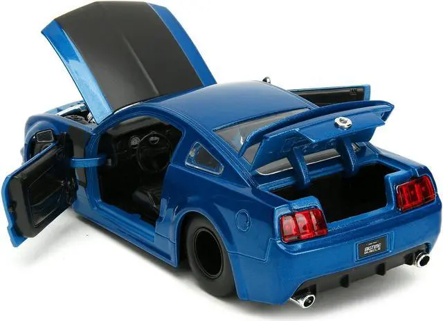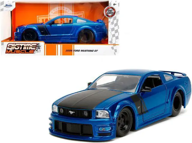 Brand new 1:24 scale diecast car model of 2006 Ford Mustang GT Blue Metallic with Matt Black Hood and Stripes "Bigtime Muscle" Series die cast model car by Jada.