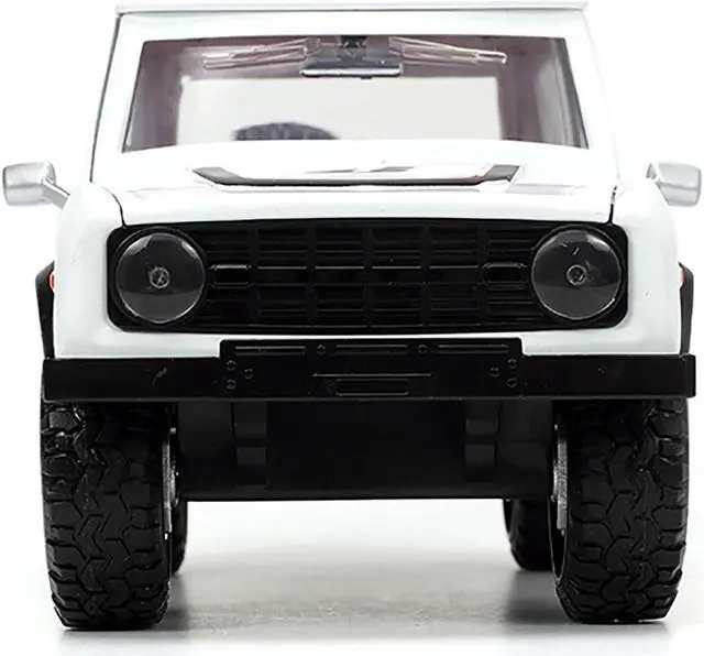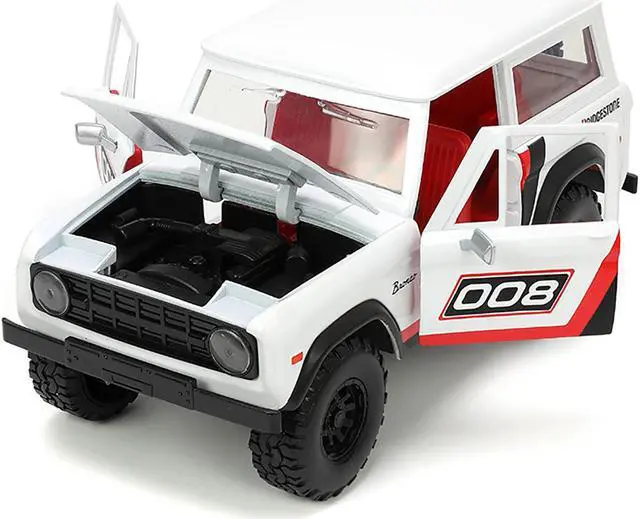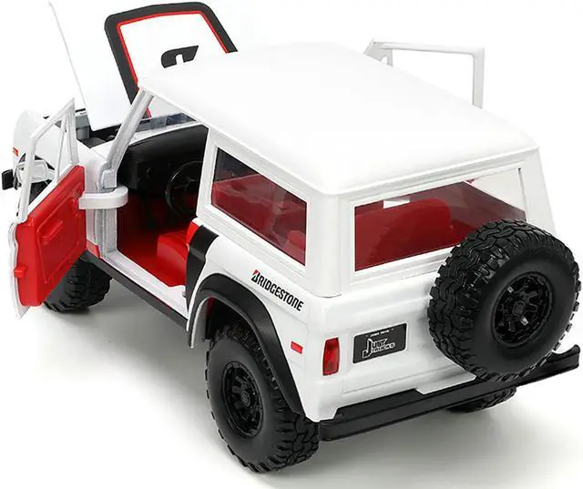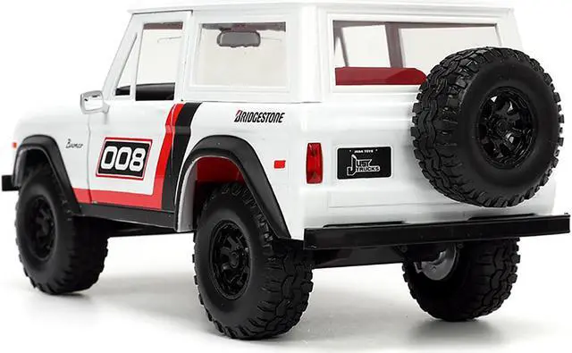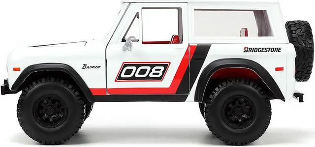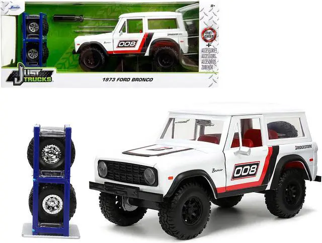 Brand new 1/24 scale diecast car model of 1973 Ford Bronco #008 White with Red and Black Stripes and Red Interior with Extra Wheels "Just Trucks" Series die cast model car by Jada.