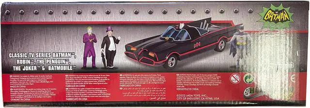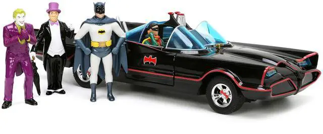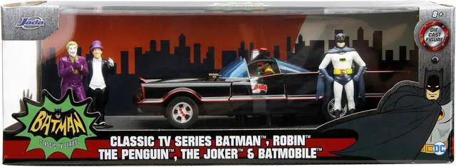 Brand new 1/24 scale diecast car model of 1966 Classic Batmobile with Diecast Batman, The Joker, The Penguin and Plastic Robin Sitting Inside The Car "Batman" TV Series (1966) "Hollywood Rides" Series die cast model car by Jada.