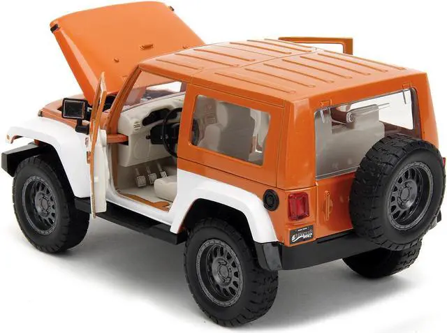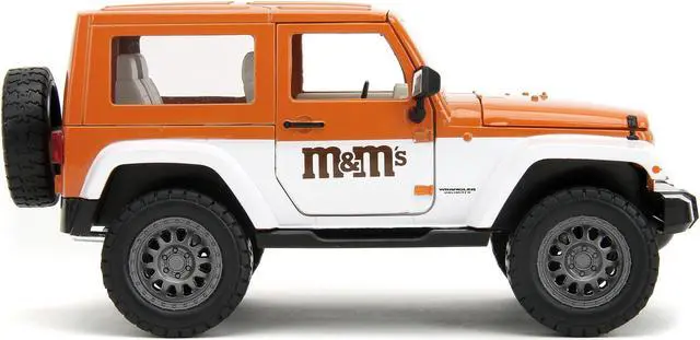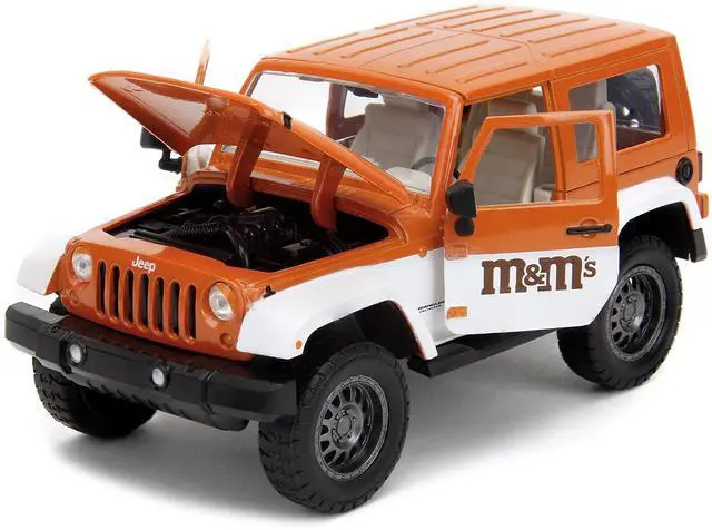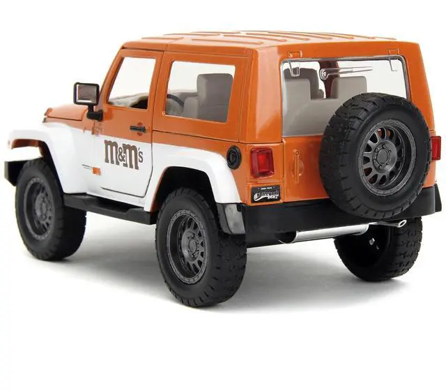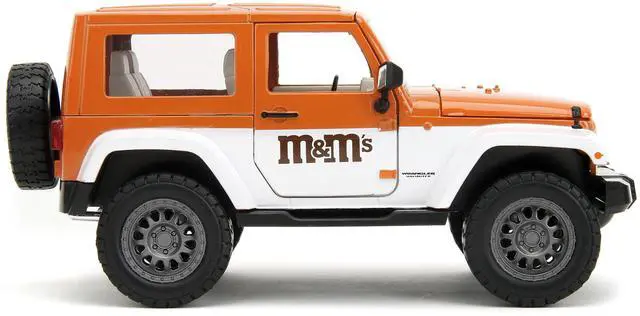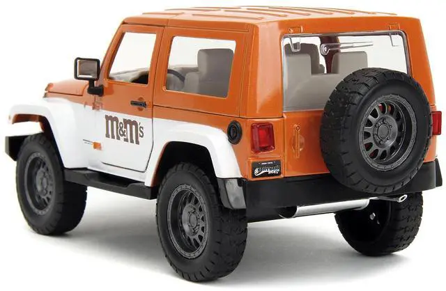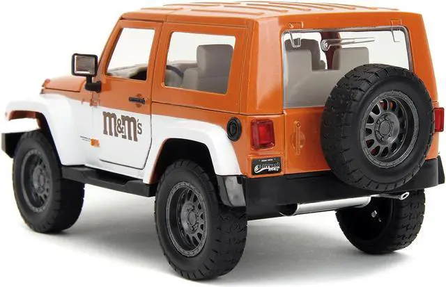 Brand new 1/24 scale diecast car model of 2007 Jeep Wrangler Orange Metallic and White and Orange M&M Diecast Figure "M&M's" "Hollywood Rides" Series die cast model car by Jada.