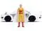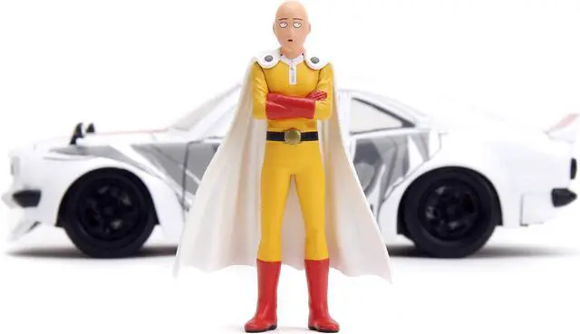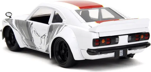 Brand new 1/24 scale diecast model of 1974 Mazda RX-3 White with Red Stripe and Graphics and Saitama Diecast Figure "One Punch Man" (2015-2019) TV Series die cast model by Jada.