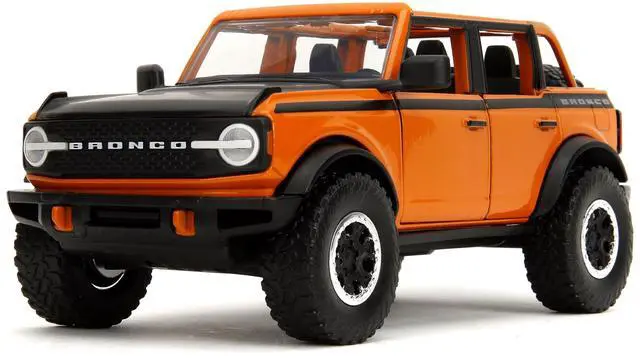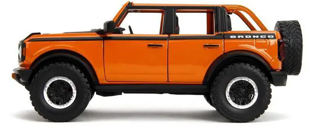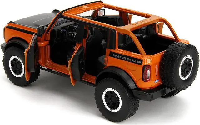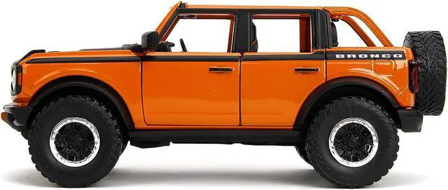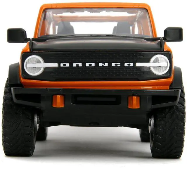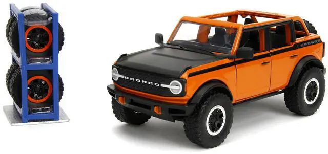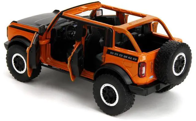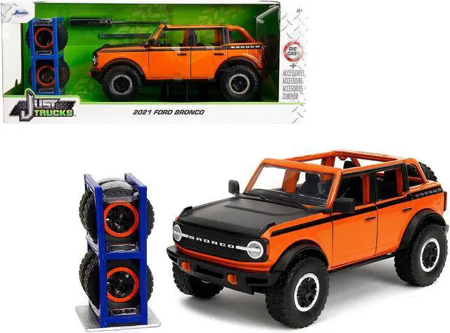 Brand new 1/24 scale diecast car model of 2021 Ford Bronco Open-Top Orange with Black Stripes and Hood with Extra Wheels "Just Trucks" Series die cast model car by Jada.
