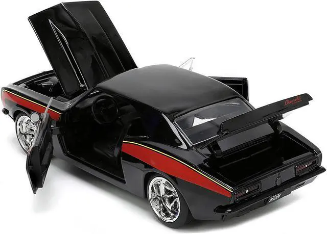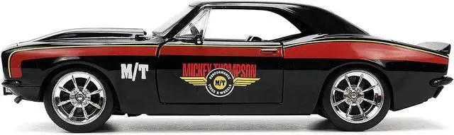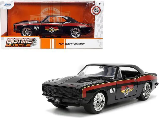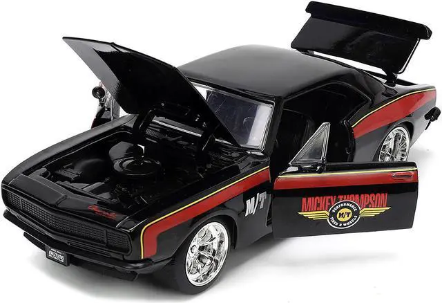 Brand new 1/24 scale diecast car model of 1967 Chevrolet Camaro "Mickey Thompson" Black with Red and Yellow Stripes "Bigtime Muscle" Series die cast model car by Jada.
