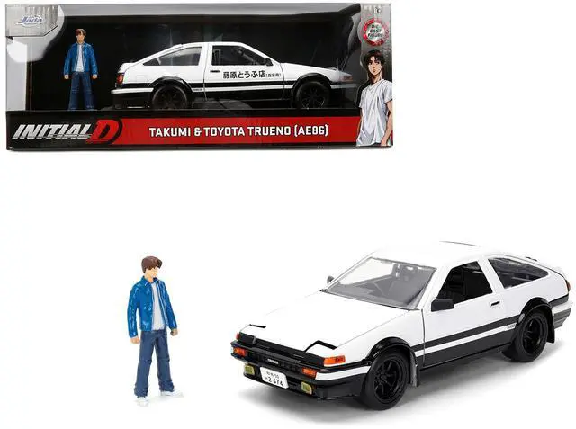 Brand new 1/24 scale diecast model of Toyota Trueno (AE86) RHD (Right Hand Drive) White and Black with Graphics and Takumi Diecast Figure "Initial D" (1998-2021) TV Series "Anime Hollywood Rides" Series die cast model by Jada.