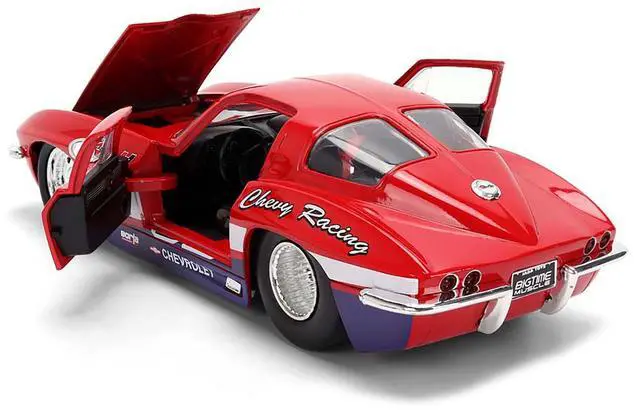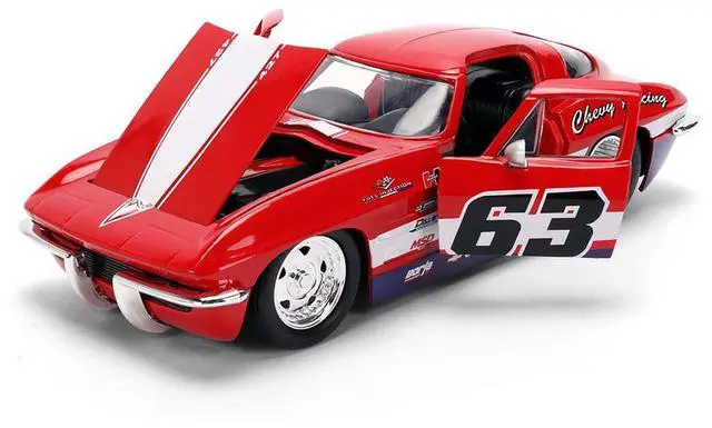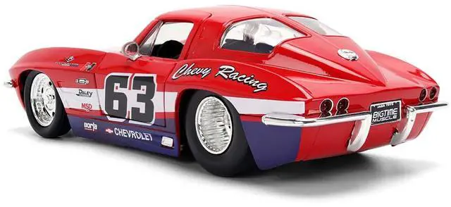 Brand new 1/24 scale diecast car model of 1963 Chevrolet Corvette Stingray #63 "Chevy Racing" Red with White and Blue Stripes "Bigtime Muscle" Series die cast model car by Jada.