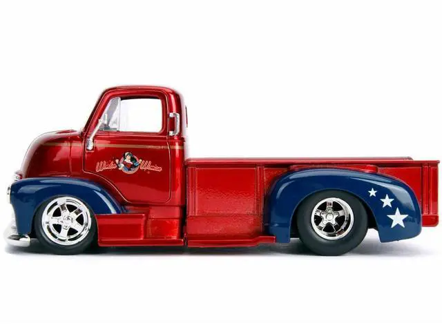 Brand new 1/24 scale diecast car model of 1952 Chevrolet COE Pickup Truck Candy Red and Blue with Wonder Woman Diecast Figure "DC Comics Bombshells" Series "Hollywood Rides" die cast model car by Jada.