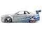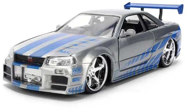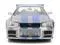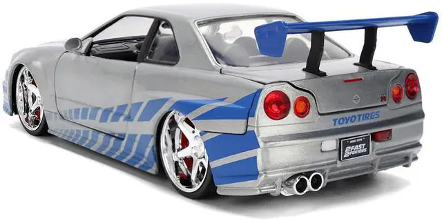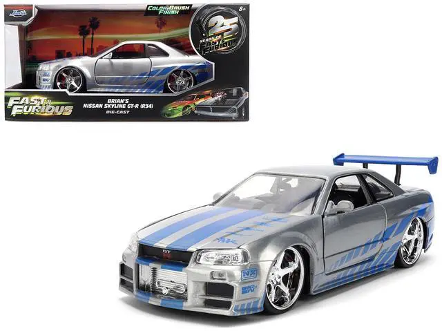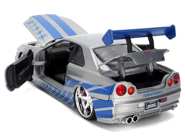 Brand new 1/24 scale diecast car model of Brian's Nissan Skyline GT-R (R34) RHD (Right Hand Drive) Silver Color Brush Finish with Blue Stripes "2 Fast 2 Furious" (2003) Movie 25 Years of Fast & Furious Anniversary diecast model car by Jada.