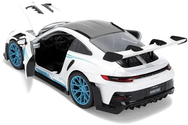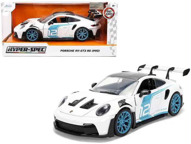 Brand new 1/24 scale diecast car model of Porsche 911 GT3 RS (992) #12 White with Blue Stripes and Carbon Top "Hyper-Spec" Series die cast model car by Jada.