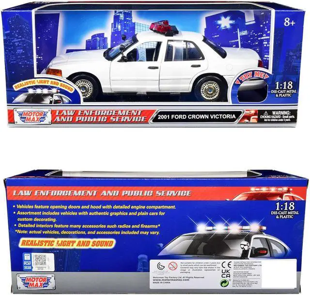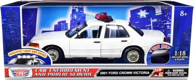 Brand new 1/18 scale diecast car model of 2001 Ford Crown Victoria Police Car Plain White with Flashing Light Bar, Front and Rear Lights and Sound diecast model car by Motormax.