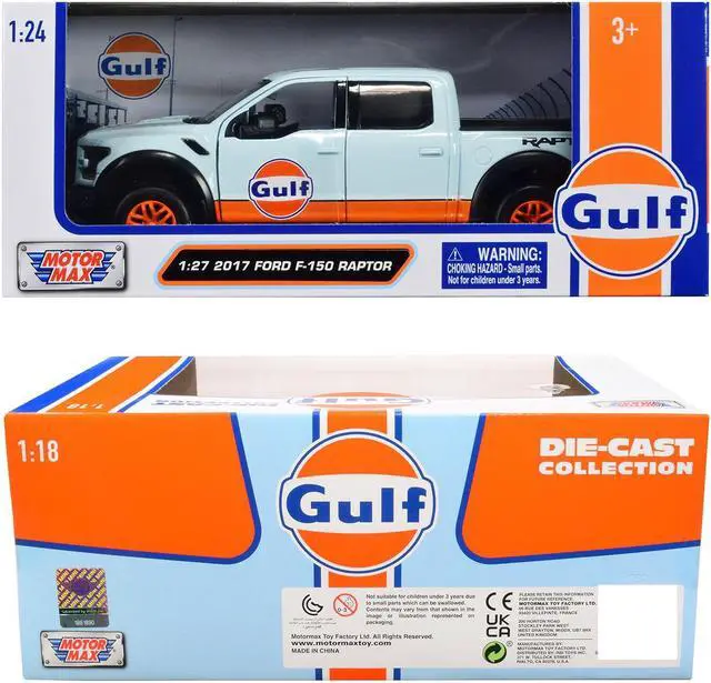 Brand new 1/27 scale diecast car model of 2017 Ford F-150 Raptor Pickup Truck Light Blue with Orange Stripes "Gulf Oil" "Gulf Die-Cast Collection" die cast model car by Motormax.