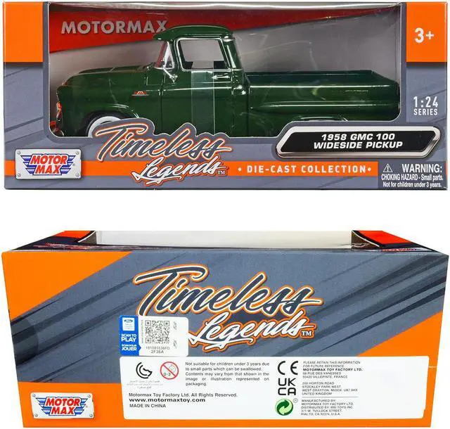 Brand new 1/24 scale diecast car model of 1958 GMC 100 Wideside Pickup Truck Green "Timeless Legends" Series die cast model car by Motormax.