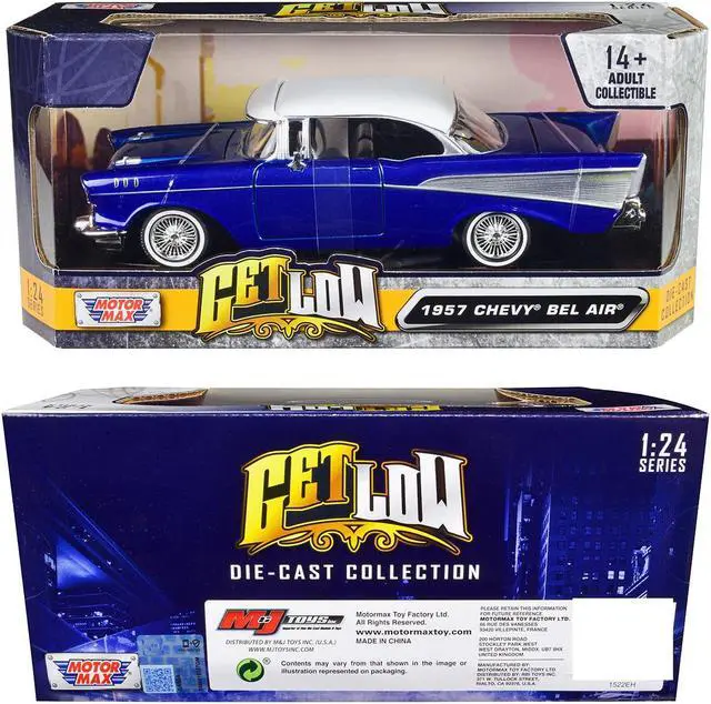 Brand new 1/24 scale diecast car model of 1957 Chevrolet Bel Air Lowrider Candy Blue with White Top "Get Low" Series die cast model car by Motormax.