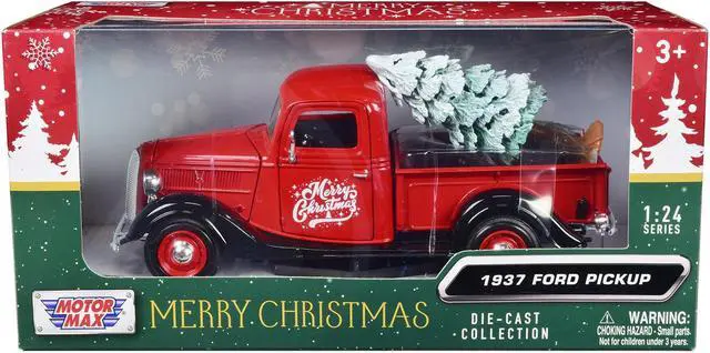 Brand new 1/24 scale die cast car model of 1937 Ford Pickup Truck Red and Black "Merry Christmas" with Tree Accessory die-cast model car by Motormax.