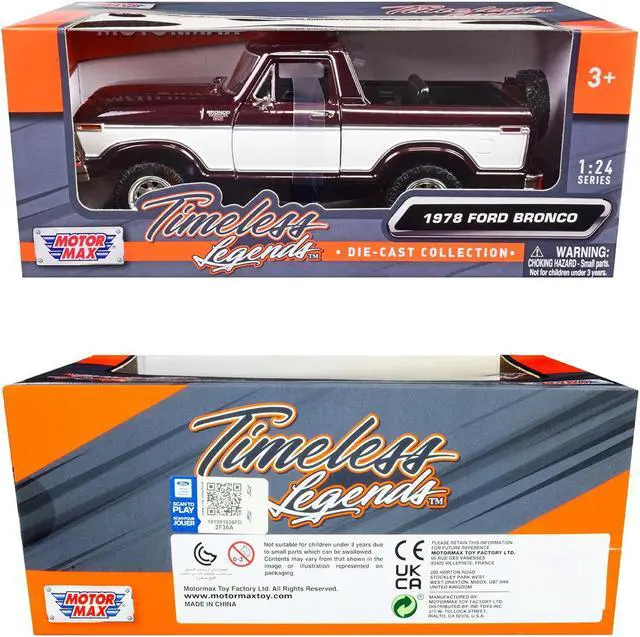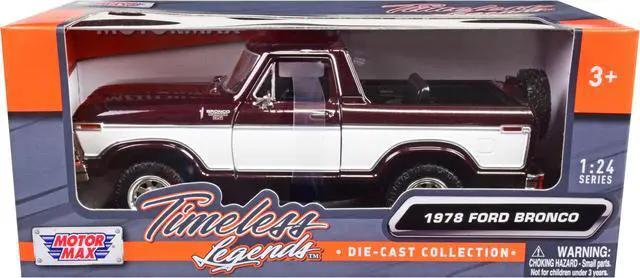 Brand new 1/24 scale diecast car model of 1978 Ford Bronco Ranger XLT (Open Top) with Spare Tire Burgundy Metallic and White "Timeless Legends" Series die cast model car by Motormax.