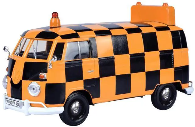 Brand new 1/24 scale diecast car model of Volkswagen Type 2 (T1) Airport Runway Delivery Van Black and Orange Checkered die cast model car by Motormax.
