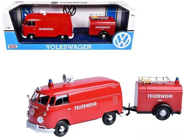Brand new 1/24 scale diecast model of Volkswagen Type 2 (T1) Fire Van with Fire Fighting Trailer "Feuerwehr" Red die cast model by Motormax.