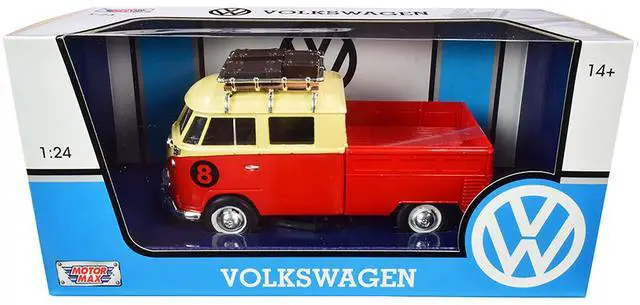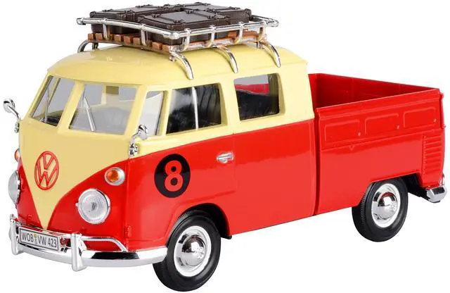 Brand new 1/24 scale diecast car model of Volkswagen Type 2 (T1) #8 Pickup Truck with Roof Rack and Luggage Red and Yellow die cast model car by Motormax.