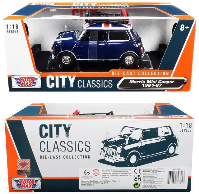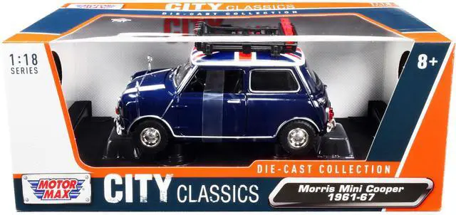 Brand new 1/18 scale diecast car model of 1961-1967 Morris Mini Cooper RHD (Right Hand Drive) Dark Blue with British Flag on the Top and Roof Rack "City Classics" Series die cast model car by Motormax.