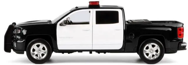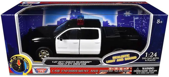 Brand new 1/27 scale diecast car model of 2017 Chevrolet Silverado 1500 LT Z71 Crew Cab Pickup Truck Black and White with Flashing Light Bar and Front and Rear Lights and Sounds die cast model car by Motormax.