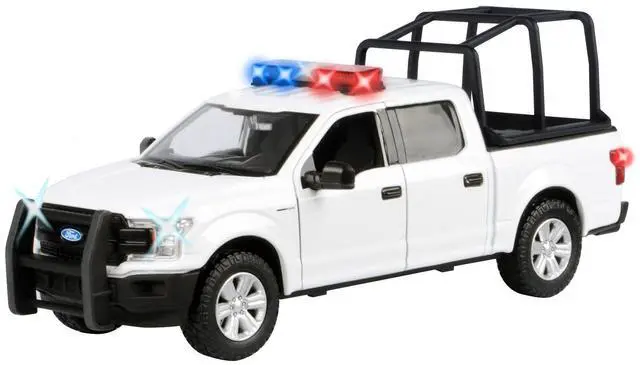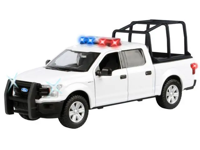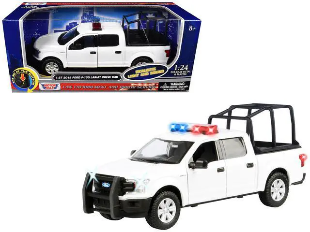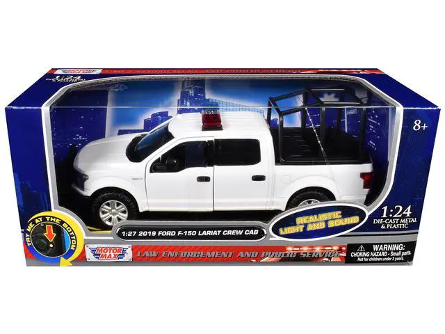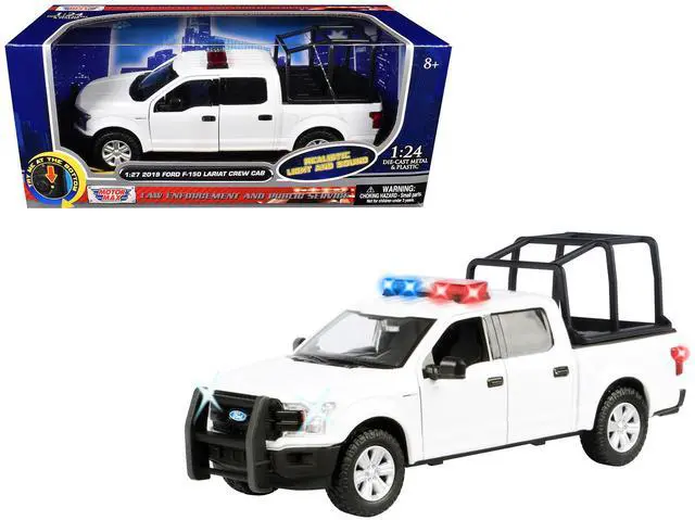 Brand new 1/27 scale diecast car model of 2019 Ford F-150 Lariat Crew Cab Pickup Truck with Bed Cage White with Flashing Light Bar and Front and Rear Lights and Sounds die cast model car by Motormax.