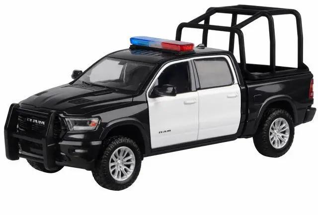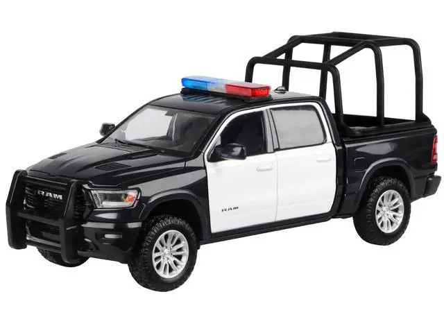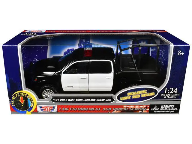 Brand new 1/27 scale diecast car model of 2019 RAM 1500 Laramie Crew Cab Pickup Truck with Bed Cage Black and White with Flashing Light Bar and Front and Rear Lights and Sounds die cast model car by Motormax.