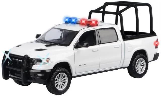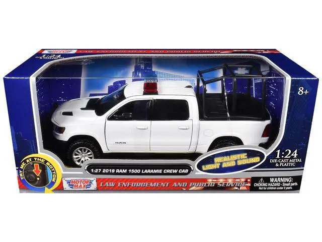 Brand new 1/27 scale diecast car model of 2019 RAM 1500 Laramie Crew Cab Pickup Truck with Bed Cage White with Flashing Light Bar and Front and Rear Lights and Sounds die cast model car by Motormax.