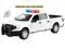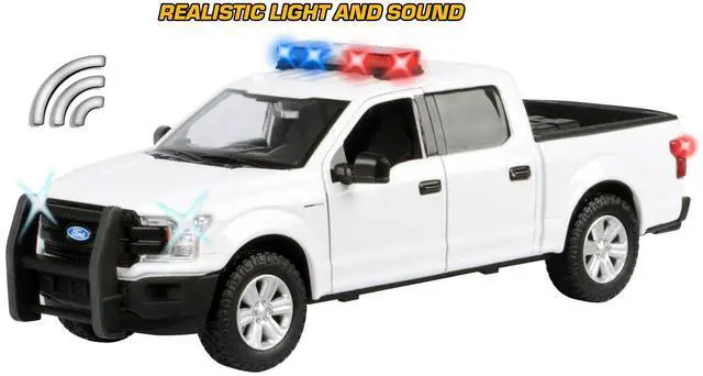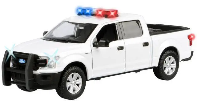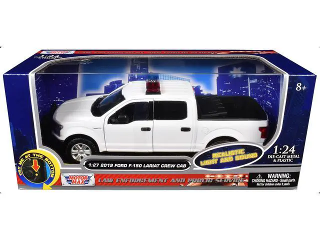 Brand new 1/27 scale diecast car model of 2019 Ford F-150 Lariat Crew Cab Pickup Truck White with Flashing Light Bar and Front and Rear Lights and Sounds die cast model car by Motormax.