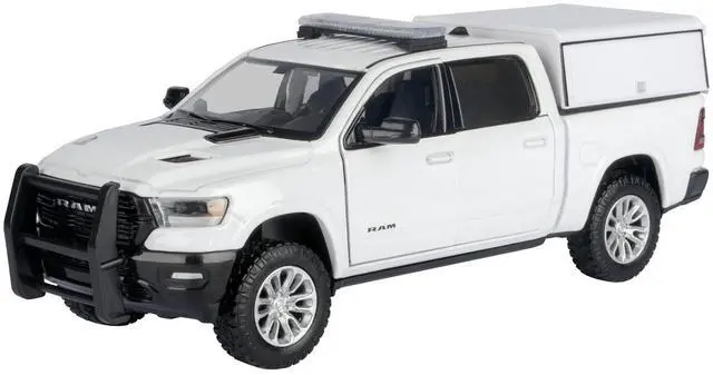Brand new 1/27 scale diecast car model of 2019 RAM 1500 Laramie Crew Cab Pickup Truck with Truck Bed Camper White "Custom Builder's Kit" Series die cast model car by Motormax.