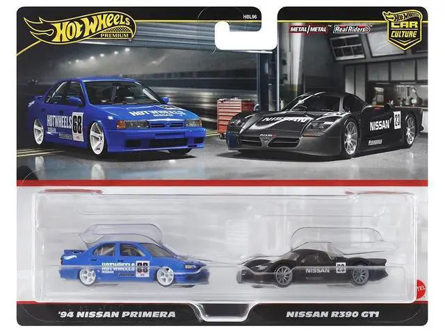 Brand new diecast car models of 1994 Nissan Primera RHD (Right Hand Drive) #68 Blue and Nissan R390 GT1 #23 Matt Black "Car Culture" Set of 2 Cars die cast model cars by Hot Wheels.