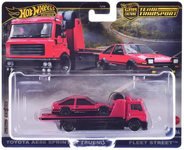 3) Fleet Street Flatbed Truck Red and Black and Toyota AE86 Sprinter Trueno Red and Black.