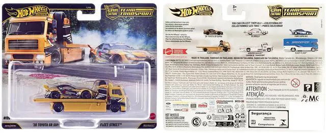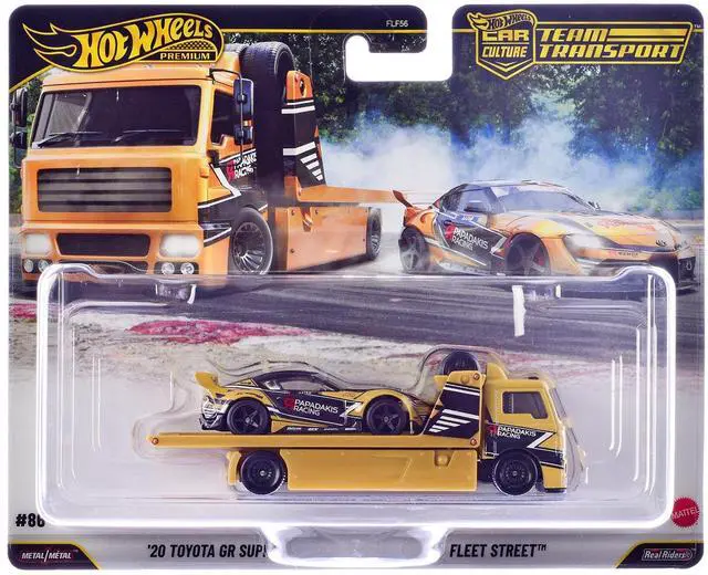 Brand new diecast car models of Fleet Street Flatbed Truck Yellow with Graphics and 2020 Toyota GR Supra #15 Yellow with Black Graphics "Papadakis Racing" "Team Transport - Car Culture" Series die cast model cars by Hot Wheels.